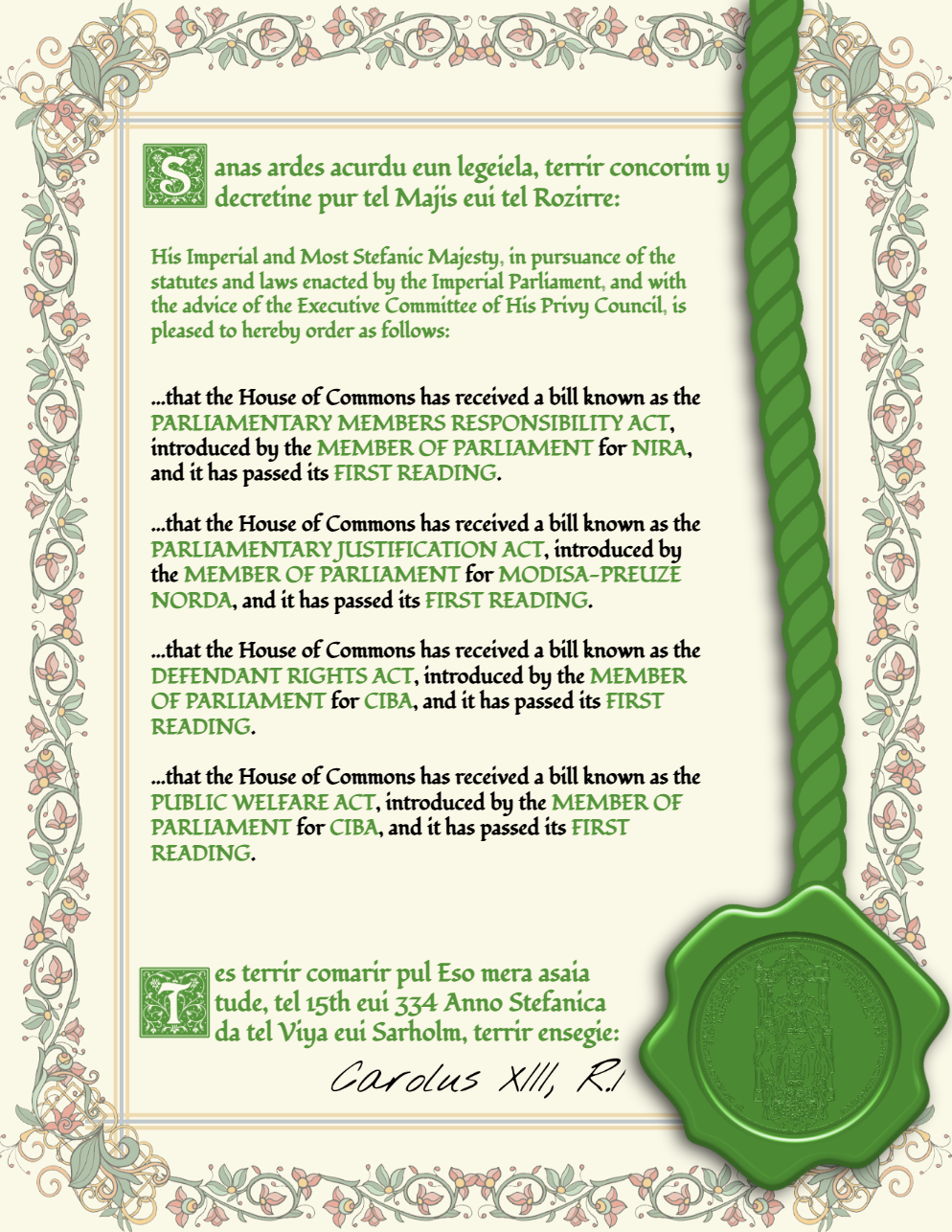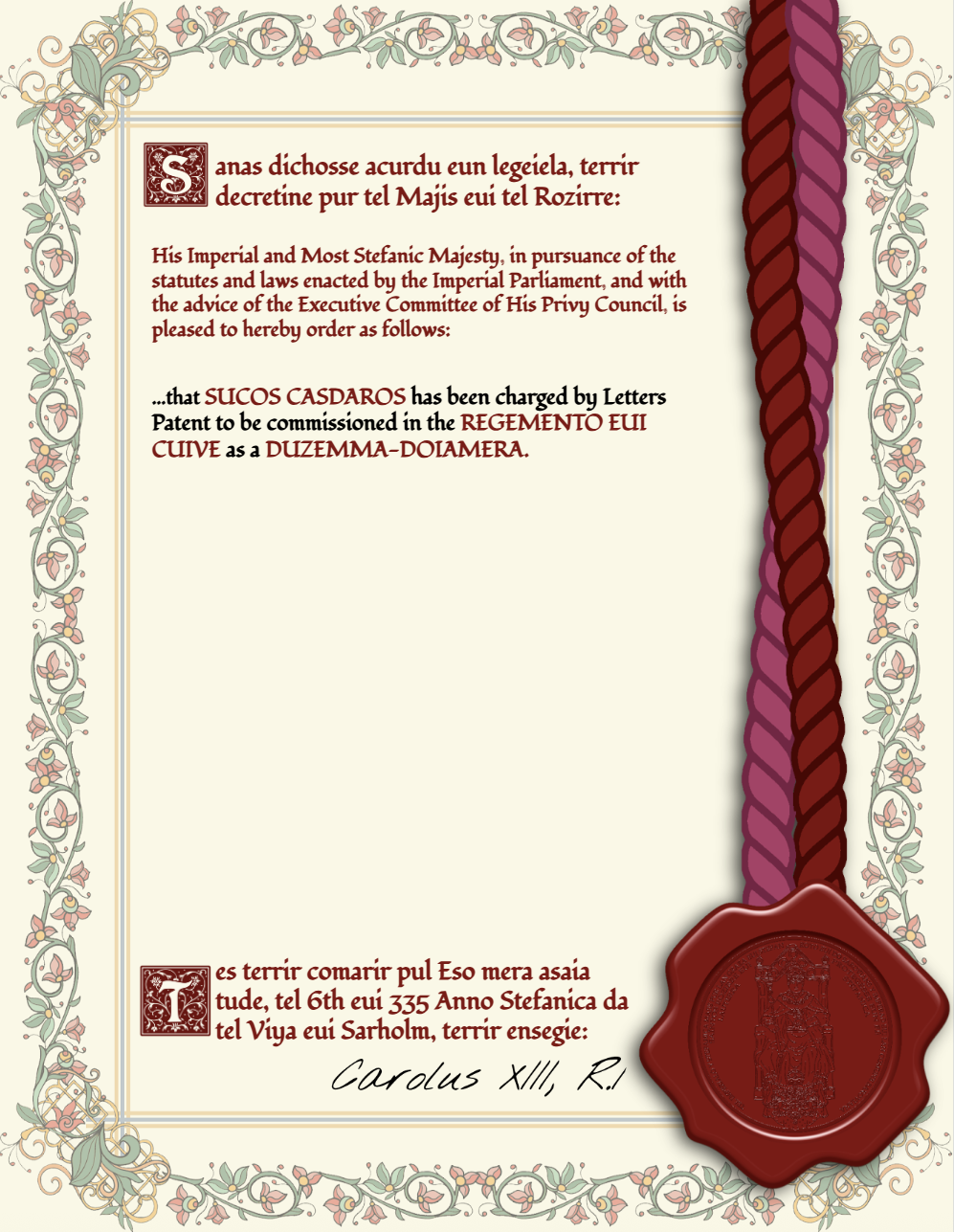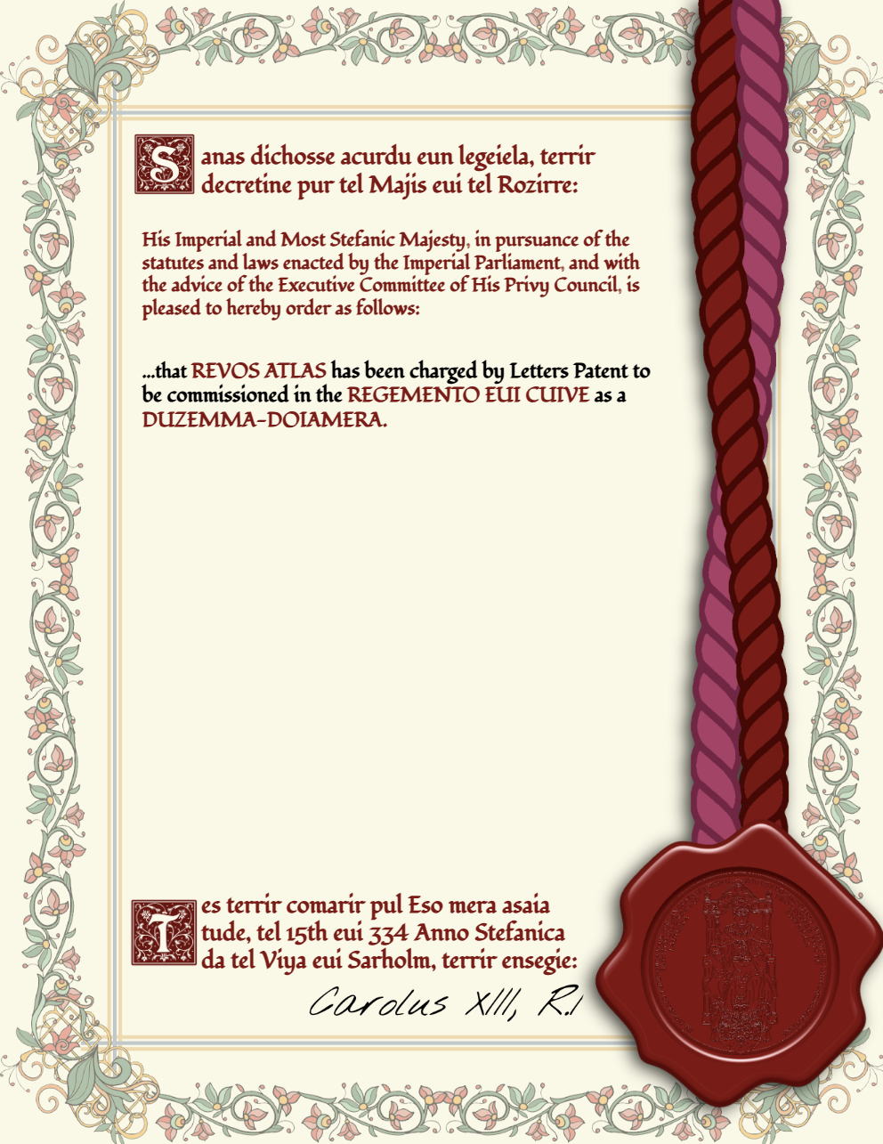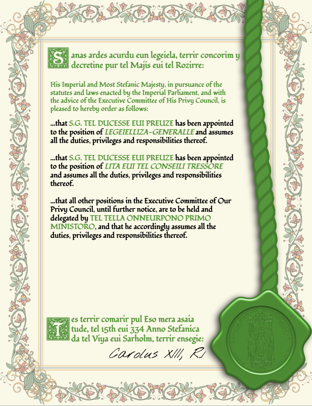 When the Sovereign is meeting with his Council, or literally rozirre-da-conseili or Sovereign-in-Council, His ministers are able to propose separate policies and agendas to which He agrees to, and uses His authority to make them law. All decisions that are made by the Sovereign-in-Council are published as RDCs, which serve as secondary legislation.