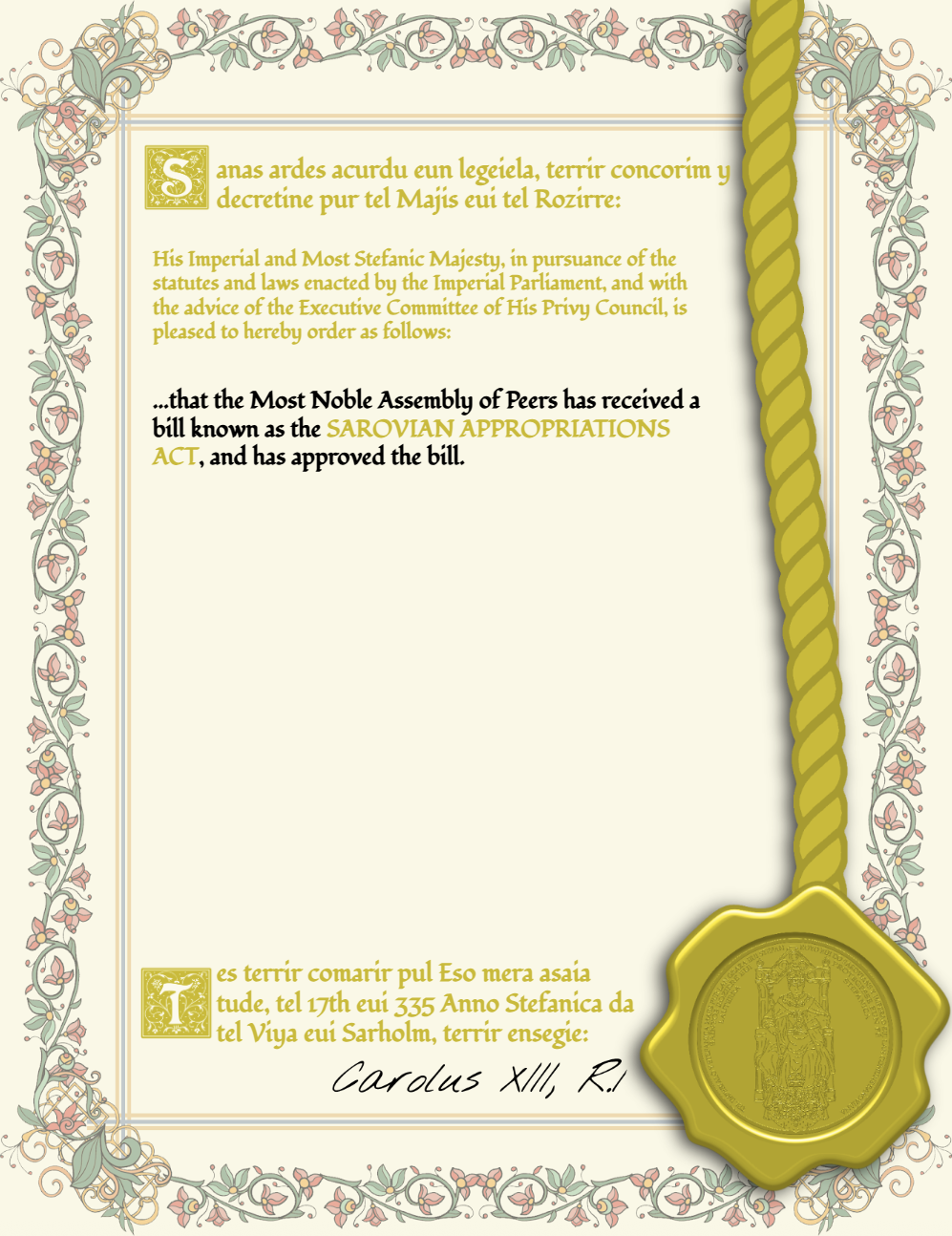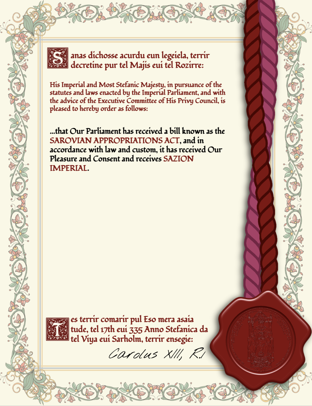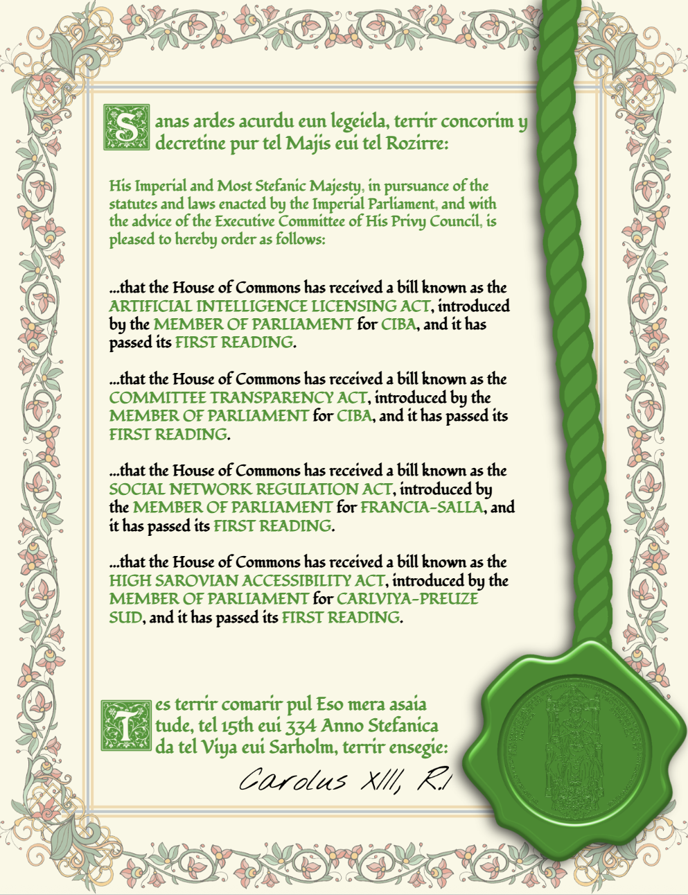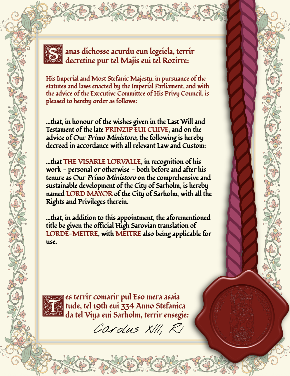 When the Sovereign is meeting with his Council, or literally rozirre-da-conseili or Sovereign-in-Council, His ministers are able to propose separate policies and agendas to which He agrees to, and uses His authority to make them law. All decisions that are made by the Sovereign-in-Council are published as RDCs, which serve as secondary legislation.
